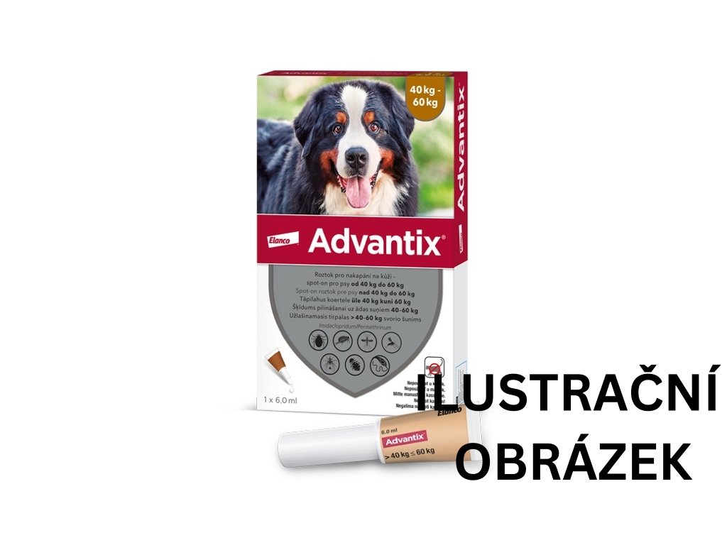 Psi od 40 do 60 kg živé hmotnosti: Advantix spot-on roztok pro psy od 40 do 60 kg (balení: 6 ml), Imidakloprid 10-15 mg/kg živé hmotnosti, Permethrin 50-75 mg/kg živé hmotnosti.