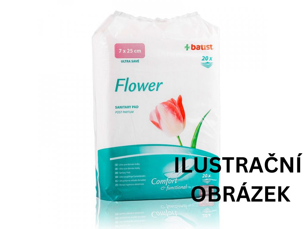 Batist Flower porodnické vložky jsou ultrasavé dámské hygienické vložky vhodné pro dámskou hygienu v období šestinedělí. Jsou sterilizované parou a dalšími medii díky absenci teplem deformovatelných vrstev. Povrch vložky z netkaného textilu odvádí tekutinu rychle a efektivně díky funkčnímu embosování. Ultrasavé jádro váže tekutinu uvnitř a zajišťuje tak maximální pocit sucha při styku s pokožkou,